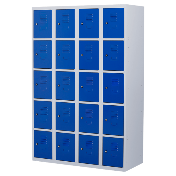 Vierdelige lockerkast 20 deurs. De lockerkasten uit de LKF-productlijn zijn uitermate geschikt voor het opbergen van persoonlijke eigendommen. Denk hierbij aan kleding, schoenen, telefoons enzovoort. Door het brede aanbod lockers, ook wel personeelskluisjes genoemd, spelen we in op al je wensen.