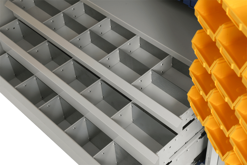 Het eerst gedeelte van de onderkant is voorzien van kunststof magazijnbakken. Deze magazijnbakken zijn gemakkelijk uit de kast te pakken. Het laatste deel van de kast is voorzien van een ladenblok met 3 laden. De laden zijn door de kogel gelagerde telescooprails volledig uittrekbaar. Daarnaast zijn de laden voorzien van een flexibel in te delen vakverdeling.